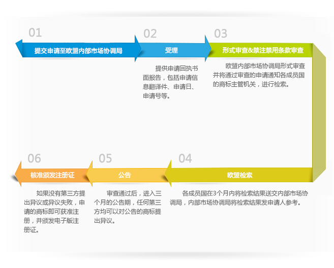 商标申请人的注册申请递交至欧盟内部市场协调局后,官方先进行形式审查和绝对理由审查,审查通过后再进入检索程序,欧盟内部市场协调局完成检索后将申请予以公告,若在公告期内(3个月)有人提出异议的则进入异议程序,若公告期内无人异议或异议未成功的,商标将被核准注册并颁发注册证。顺利的情况下,完成注册约需1~1.5年左右。